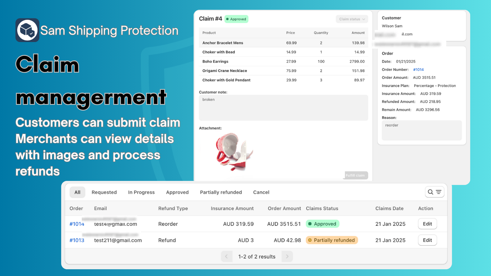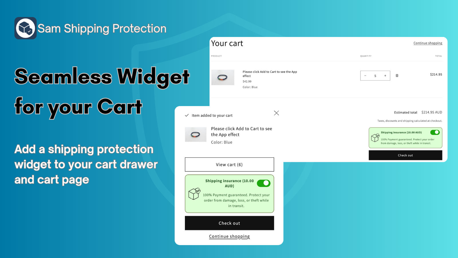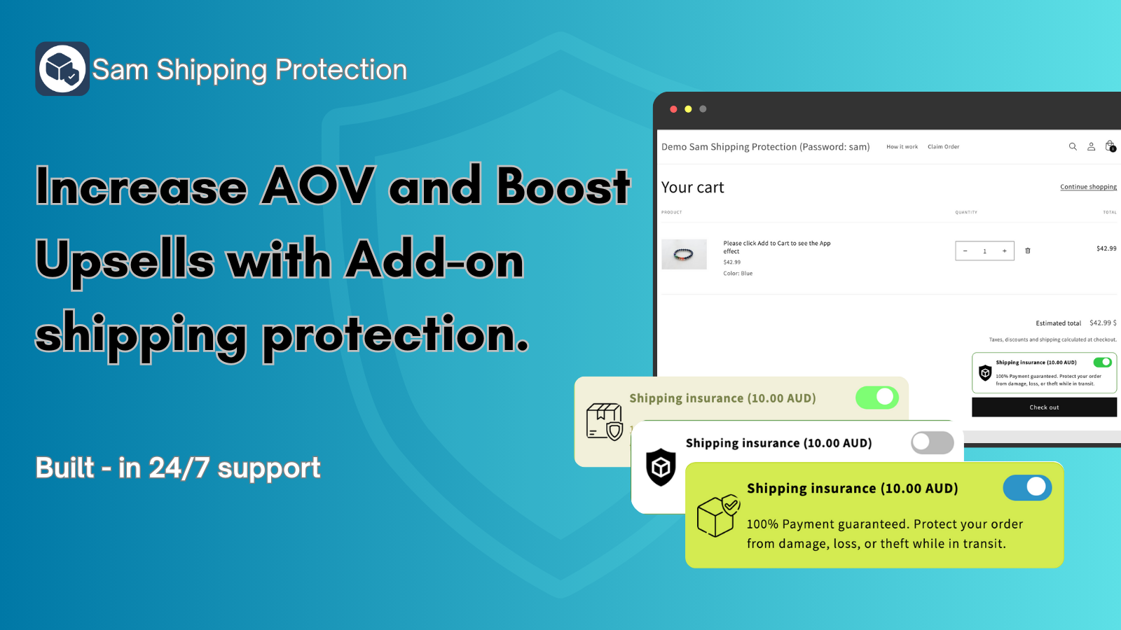 Create your own insured shipping with Sam Shipping Protect! Protect stolen or broken items and keep 100 percentage of protection fees. Customize insurance plans based on cart subtotals. Provide order protection, allowing customers to submit claims with images and descriptions, and merchants to fulfill claims via refund. Automatically add insurance to qualifying carts and receive email notifications for all events.